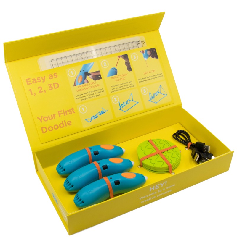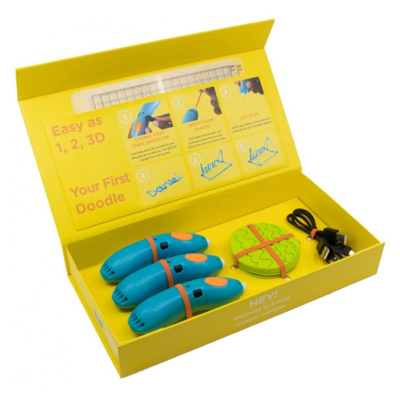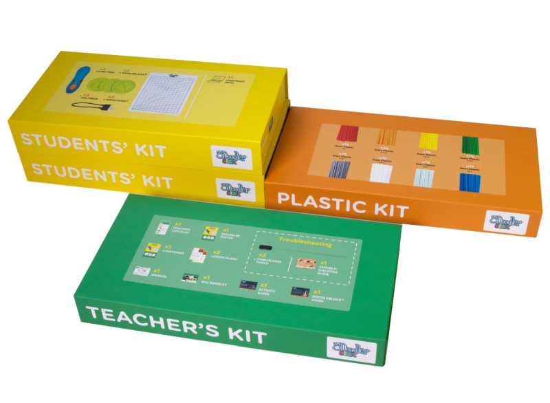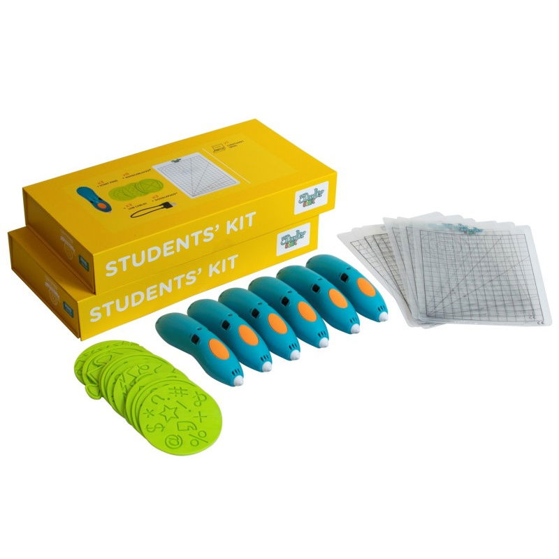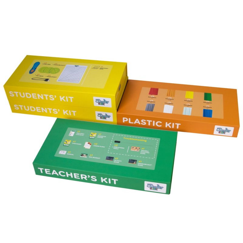 Each of the two student kits includes: 3 3Doodler Start+ 3D pens , 3 USB Type-C cables, 6 DoodleBlock stencils and 3 DoodlePad pads . This allows students to create 3D projects, developing their manual skills and creativity, and learning teamwork, planning and precision.
