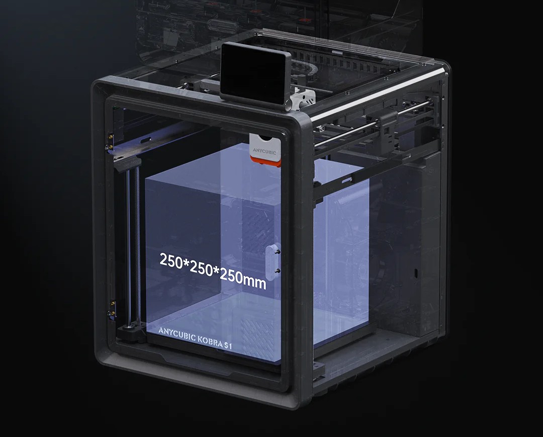 Anycubic Kobra S1 is based on the stable, fully enclosed CoreXY structure , which guarantees minimal vibrations even when printing at high speeds. Thanks to the large working area of 250 x 250 x 250 mm , you can create both larger models and complex projects without the need to divide them into parts. The transparent polycarbonate housing provides optimal conditions for demanding materials such as ABS or ASA .