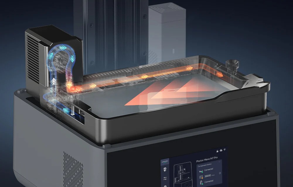 The printer features auto-adaptive temperature control technology that keeps the resin in optimal conditions during printing. Thanks to this, the Photon Mono M7 Pro automatically adjusts the vat temperature, which affects better efficiency and increases the success rate of prints, especially with more demanding materials.