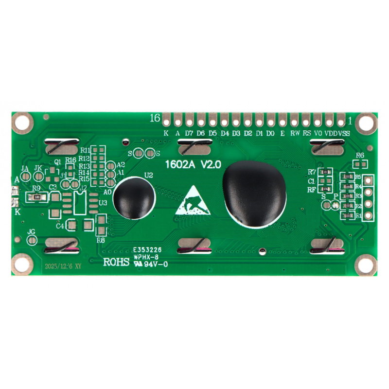 Alphanumeric LCD display manufactured by justPi. It presents values in two lines, 16 characters in each. It is powered by 5V. It is characterized by extremely simple operation, high availability and numerous support for many microcontrollers.