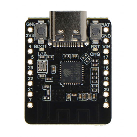 Beetle ESP32-C6 is a miniature development board with dimensions of 25 x 20.5 mm , comparable to a coin. Equipped with a 32-bit RISC-V processor at 160 MHz , it offers support for many communication protocols such as WiFi 6, Bluetooth 5, ZigBee 3.0, Thread 1.3 and Matter , making it a versatile solution for a variety of IoT networks. Integrated battery charging management eliminates the need for additional modules, simplifying the design and reducing the size of projects. Additionally, the board enables monitoring of the battery voltage , which allows for early detection of low charge and ensures continuous operation of the device.