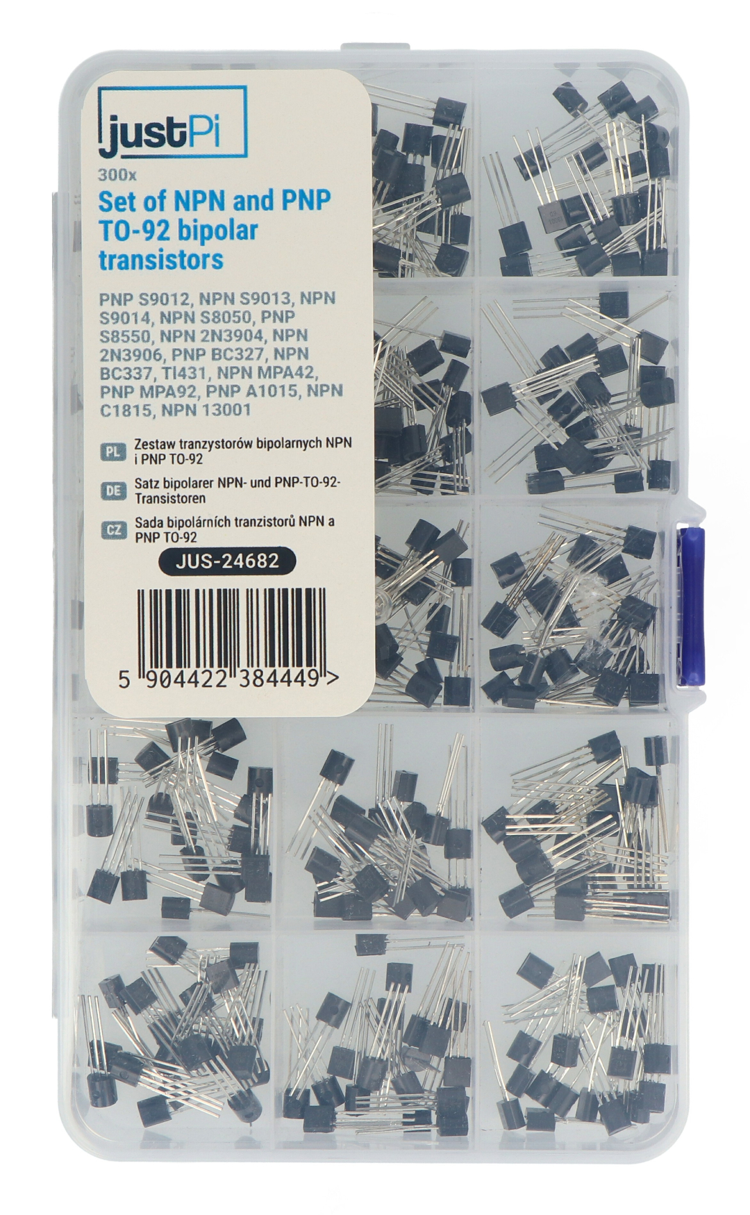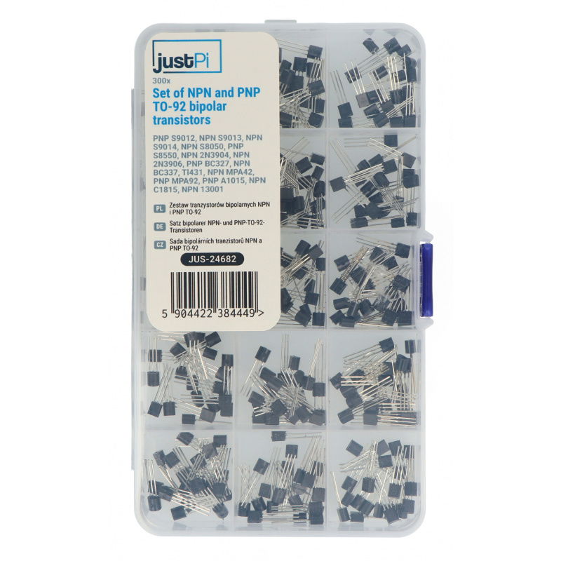 Product description: Set of NPN and PNP TO-92 bipolar transistors - 15 values - E49 - 300 pcs. - justPi