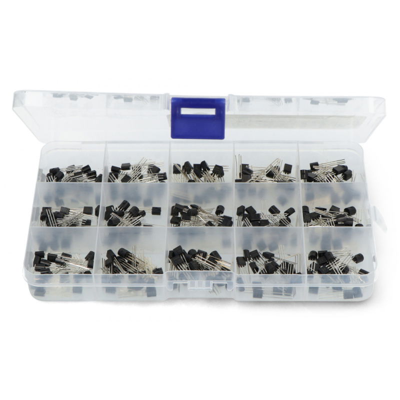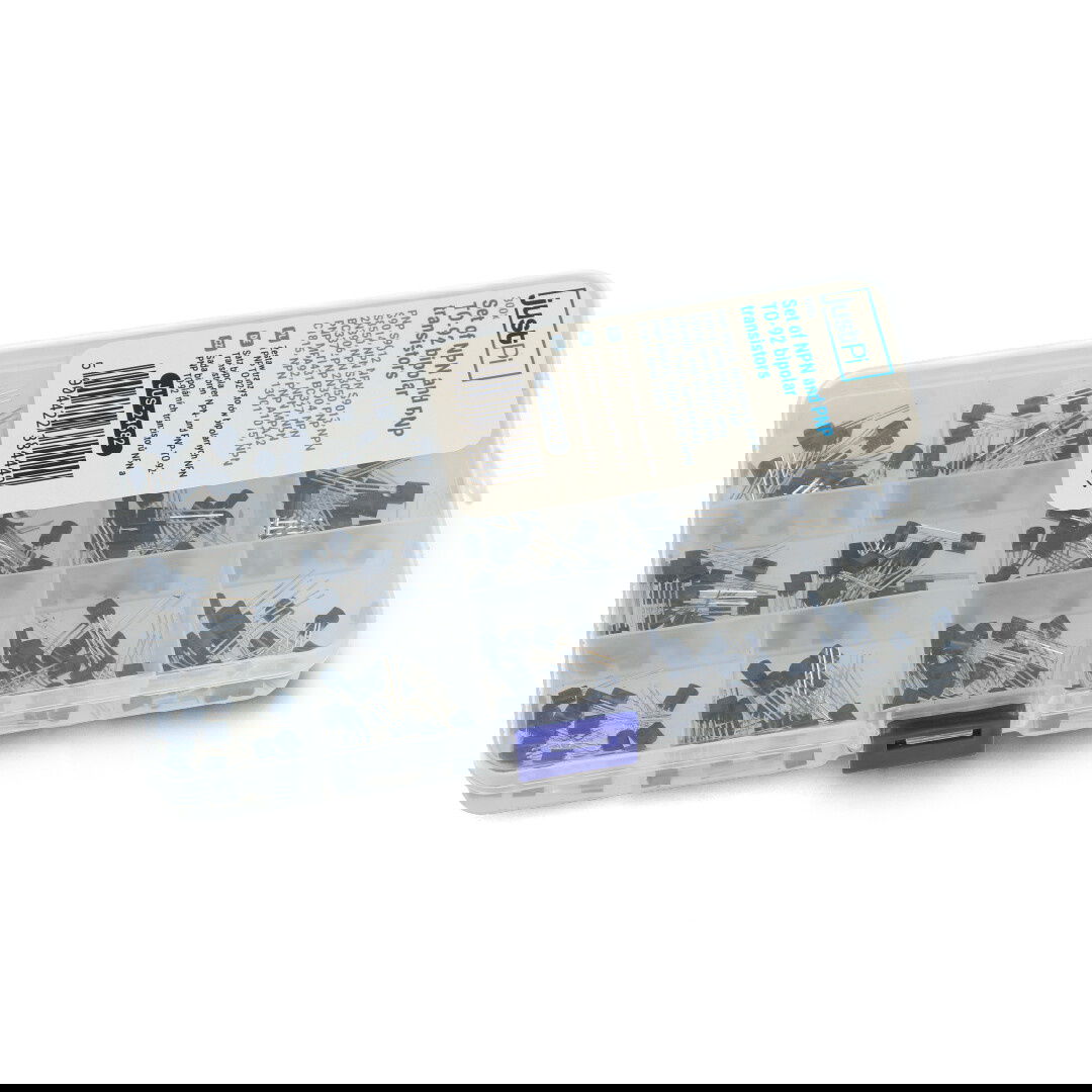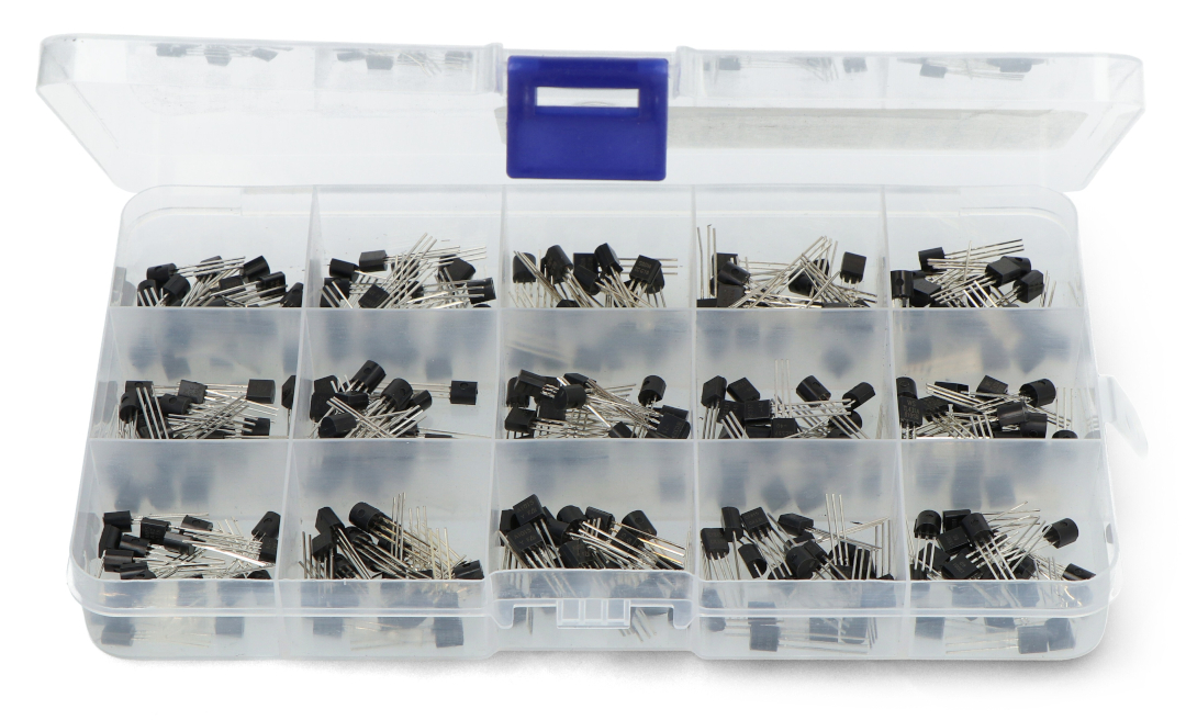 A complete set of NPN and PNP bipolar transistors . The set includes 15 different types , 20 pieces each, for a total of 300 transistors . All components are housed in a compact, transparent organizer that simplifies work and helps keep your workspace organized . Additionally, each transistor is printed with a designation, making it easy to quickly identify the component type.