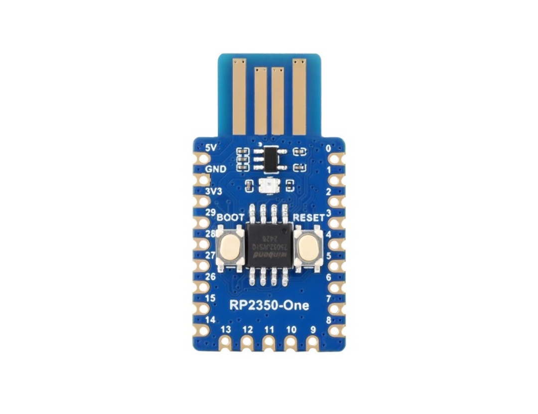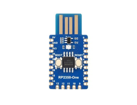The P2350-One is a modern MCU board based on the Raspberry Pi RP2350A chip. Its unique dual-core architecture combines ARM Cortex-M33 and Hazard 3 RISC-V processors, clocked at up to 150 MHz , providing powerful computing power even for demanding projects. The board features a built-in USB Type-A connector for plug-and-play operation, eliminating the need for additional cables. With 29 multifunction GPIO pins and 12 programmable PIOs, you can easily control external devices and create custom peripherals. The RP2350 -One supports low-power modes (sleep and dormant), making it energy-efficient, while the WS2812 RGB LED allows for status indication without additional components. The board's compact design and dedicated pinout make it ideal for SMD designs and integration into off-the-shelf devices.