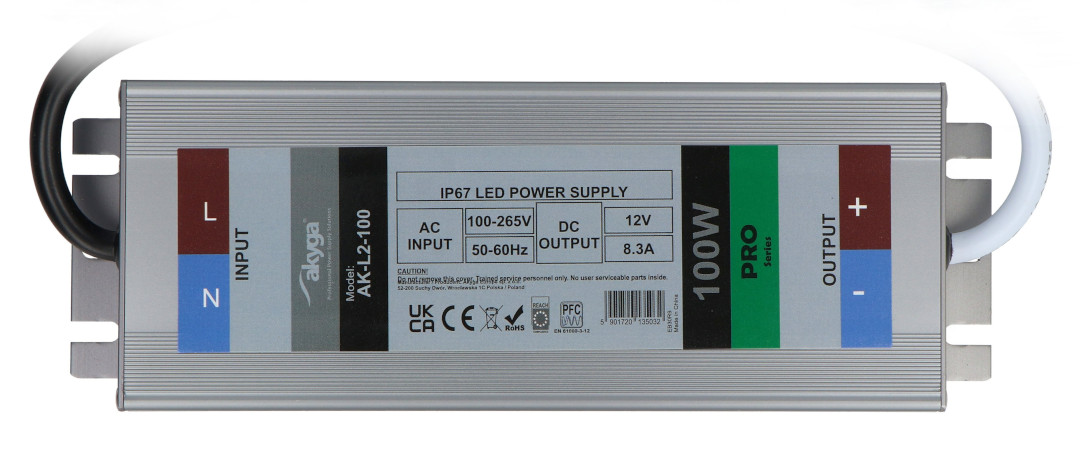 100 W power supply designed to supply lighting based on LED technology, e.g. tapes, lights, panels, RGB controllers and the other devices with DC of 12 V. Thanks to the IP67 protection you can use it both outside and inside the building. The maximum current efficiency is 8.3 A, which for example allows you to power a 20 m LED strip with a consumption of 4.8 W / m. In addition to supplying LED lighting, the power supply can be successfully used for industrial automation systems, machine control, etc.
