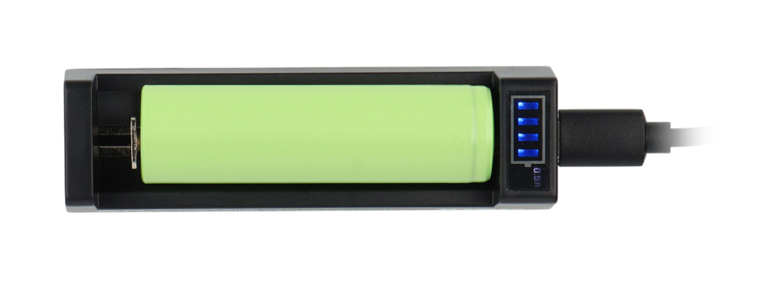We offer a charger for various battery sizes – this charger is suitable for 10440, 14500, 14650, 16340, 17335, 17500, 17670, 18350, 18490, 18500, 18650, 18700, 20700, 21700, 22650, 25500, and 26650 cells. The device features a spring-loaded system, allowing the battery bearing length to vary depending on the needs. The charger also features automatic charging parameters based on the battery's internal condition. Depending on the connected power source, a current of 500 mA or 1000 mA is activated.