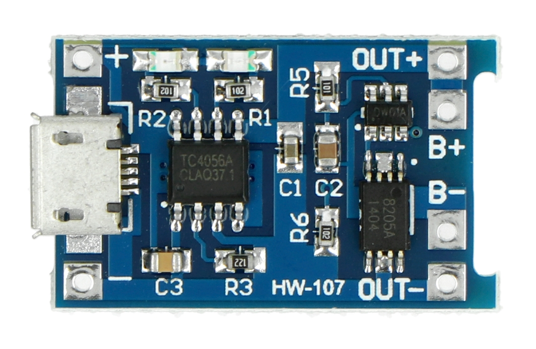 A simple charger for single-cell lithium-ion batteries with a nominal voltage of 3.7 V. The maximum charging current is 1000 mA. The system is powered via a microUSB connector or via cables connected to the IN+ and IN- inputs. The module is protected against over-discharge below 2.5 V and over-current above 3 A.