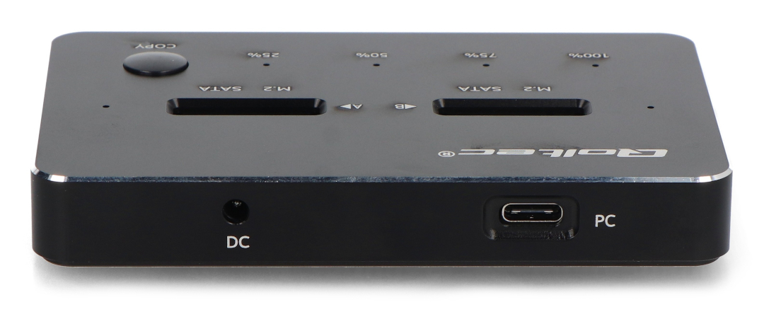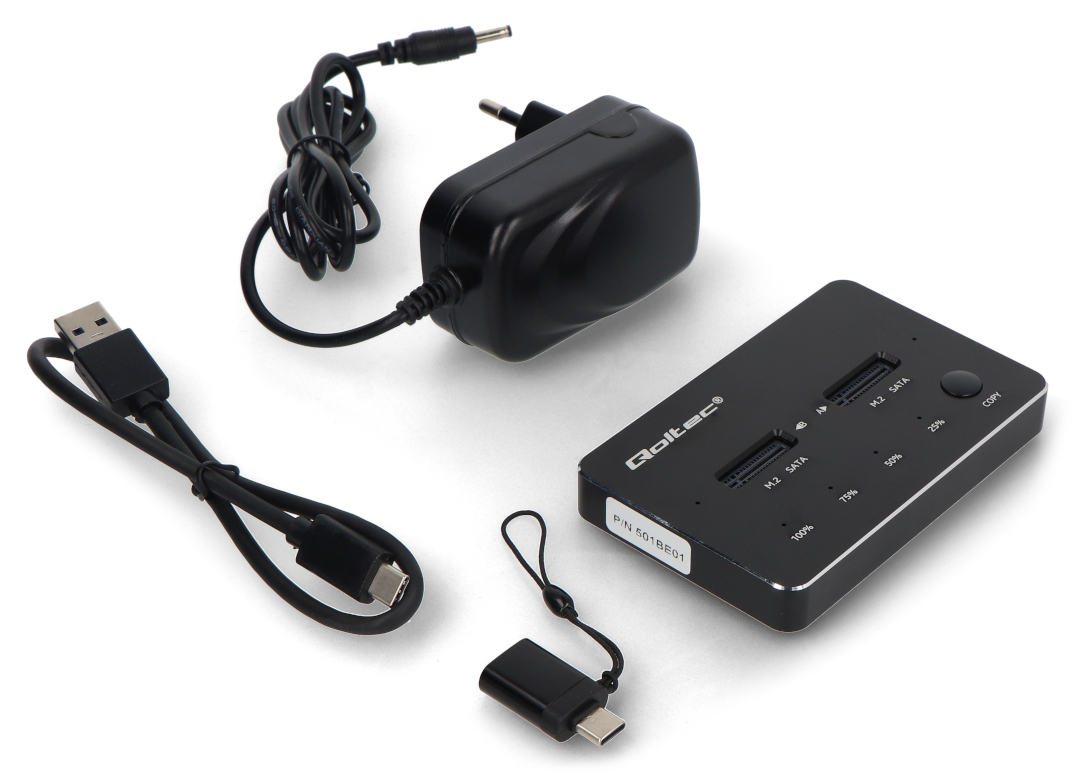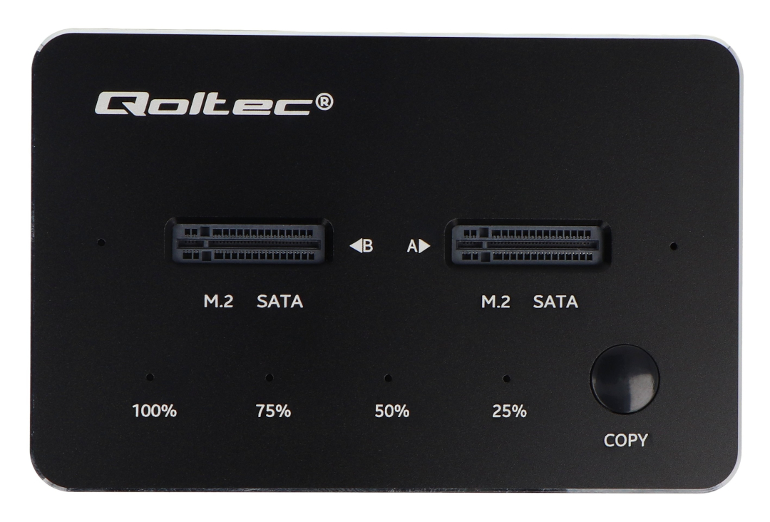 The Qoltec docking station is a functional and modern solution for users who require quick access to data and convenient file copying. It supports two SSD drives with a total capacity of up to 4 TB (max. 2 TB per drive), making it an ideal tool for both work and data archiving. Thanks to the USB Type-C interface, the station enables a quick connection to a computer, and the JMS561U chipset provides data transfer speeds of up to 6 Gb/s , significantly reducing large file transfer times. UASP support further increases performance by optimizing the command queue and streamlining work with SSD drives. The station also offers an offline copy function , allowing data to be transferred between drives without the need for a computer. Built-in LEDs provide real-time progress updates, enhancing user comfort. The station is compatible with M-Key and B&M-Key SSDs and supports a wide range of sizes: 2230, 2242, 2260, 2280, and 22110. Additionally, thanks to the plug and play feature, it's ready to work immediately after connection, without the need to install additional software.