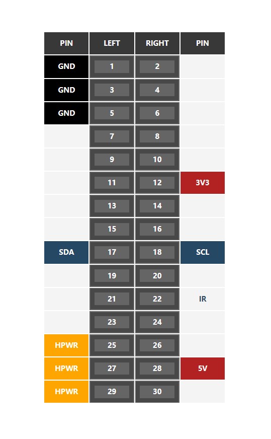 The Fan v1.1 module connects to the M5Stack CoreS3 , Core2 , Core Basic , and other base stations via the M5-Bus. Key signal lines are I2C_SDA and I2C_SCL . These are Fixed Connect connections, meaning they cannot be switched (pin assignments cannot be changed). The module is powered by 5V , and ground is connected via dedicated GND lines. The connection diagram is presented in detail in the user guide and should be reproduced in the source code.