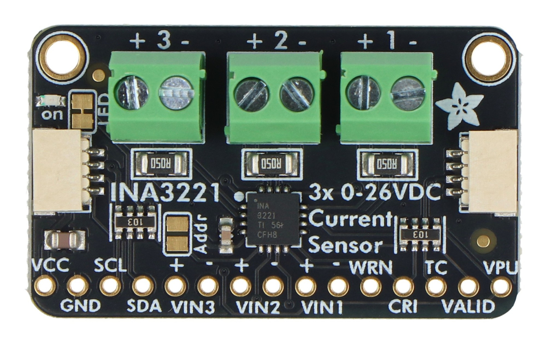 The Adafruit INA3221 works with many popular platforms, such as Arduino , Raspberry Pi , CircuitPython boards, and other microcontrollers that support the I2C bus. Compatibility with 3V and 5V logic allows for easy integration with both simple hobby projects and more advanced measurement systems. STEMMA QT/Qwiic connectors further accelerate integration with modern development kits. The manufacturer provides ready-made libraries for Arduino and CircuitPython/Python , significantly reducing implementation time. Reading the bus voltage, shunt voltage, and current for each channel can be accomplished with a few simple commands. This makes the module well-suited for both learning electronics programming and projects requiring continuous energy consumption monitoring.