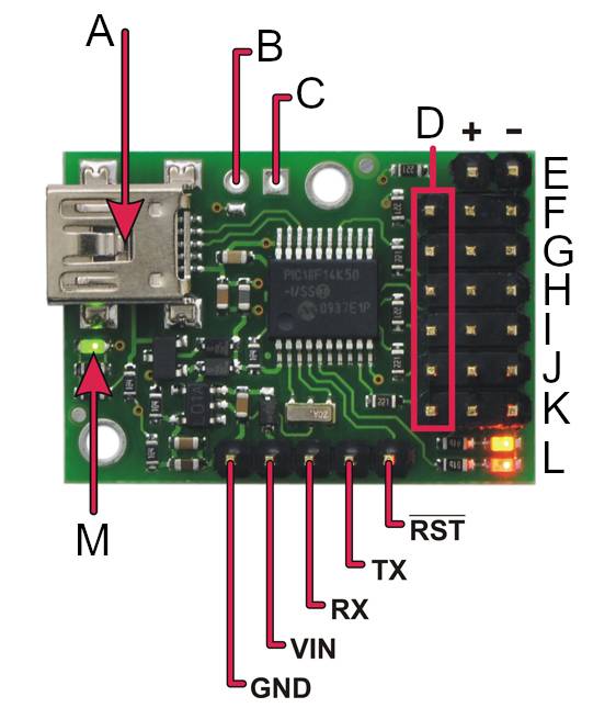 A - USB mini-B connector, B - 5 V (out), C - GND, D - signal, E - servo power supply, F - channel 0, G - channel 1, H - channel 2, I - channel 3, J - channel 4, K - channel 5, L - yellow and red status LEDs, RST - board reset, TX - TTL serial output, RX - TTL serial input, VIN - 5 V to 16 V board power supply, M - green USB LED