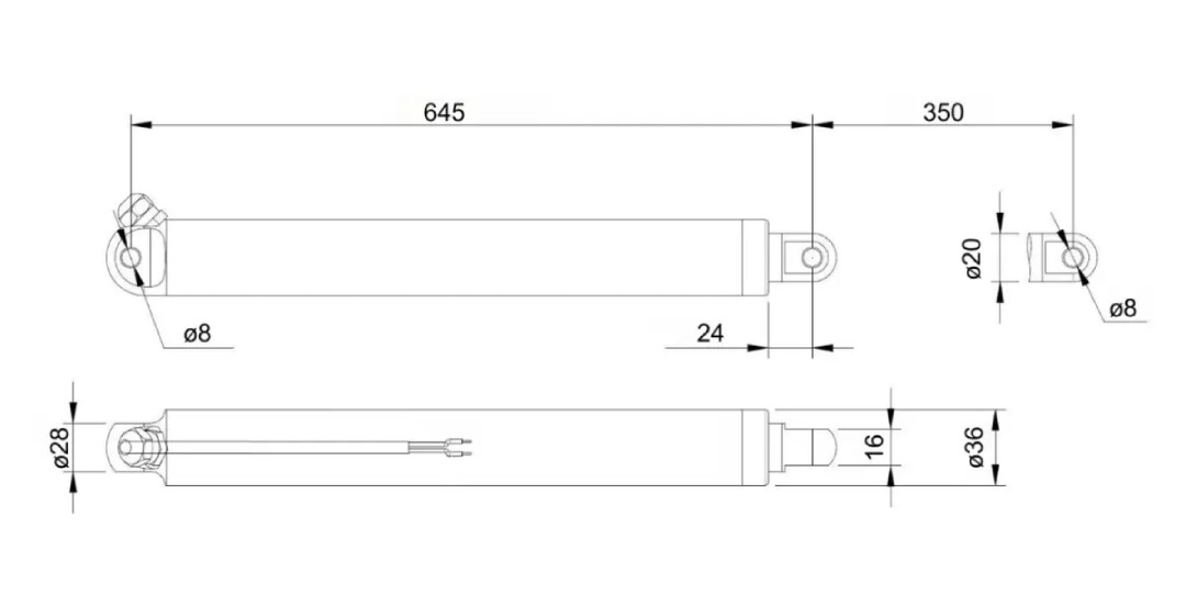 The TLA-2 actuator is powered by 12 V DC . The direction of piston rod movement depends on the voltage polarity . Built-in mechanical limit switches stop movement when the maximum extension or retraction is reached. For connection, use cables with a minimum cross-section of 2 x 0.75 mm² . The actuator can be controlled manually or using relay controllers. Installation is carried out using mounting holes with a diameter of 8 mm.