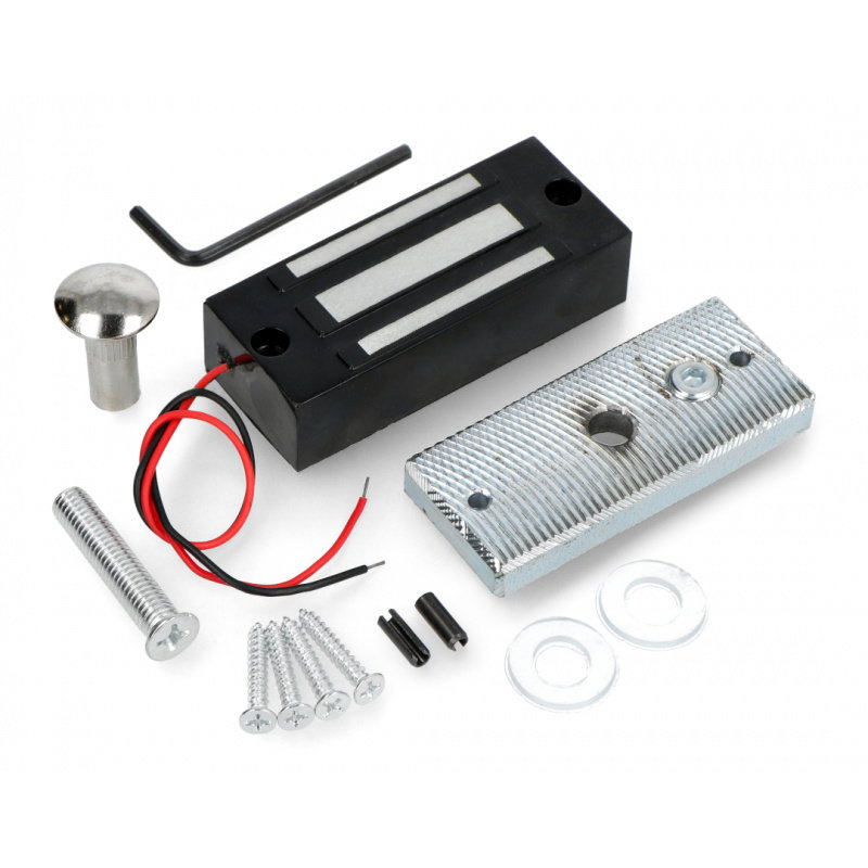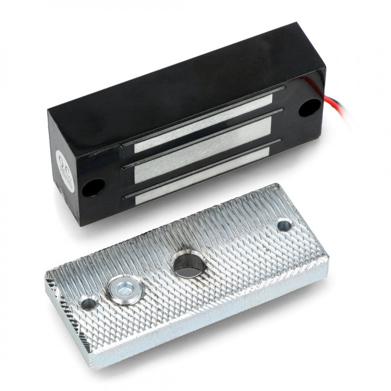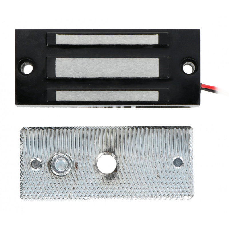 A holding electromagnet powered by 12V . It holds a mass of 60kg at the standard acceleration of gravity of 9.8 m/s². The electromagnet dimensions are 80 x 37 x 23.6mm. A set of mounting screws is included. The device can be used as an actuator controlled by any microcontroller, such as an Arduino . Note that the electromagnet draws too much power to connect directly to a microcontroller pin. A relay , optoisolator , or transistor amplifier can be used for this purpose.