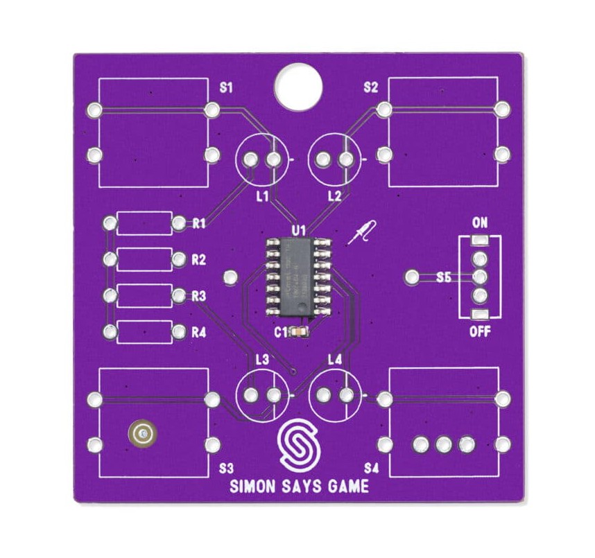 The Simon Says Game kit was designed with beginners in mind – PCB markings and a limited number of THT components make the soldering process intuitive and enjoyable . The Attiny404 microcontroller is pre-programmed using the Arduino IDE , and the entire project is open-source. Once assembled, the game is ready to play, but there's nothing stopping you from modifying its logic and creating your own versions!