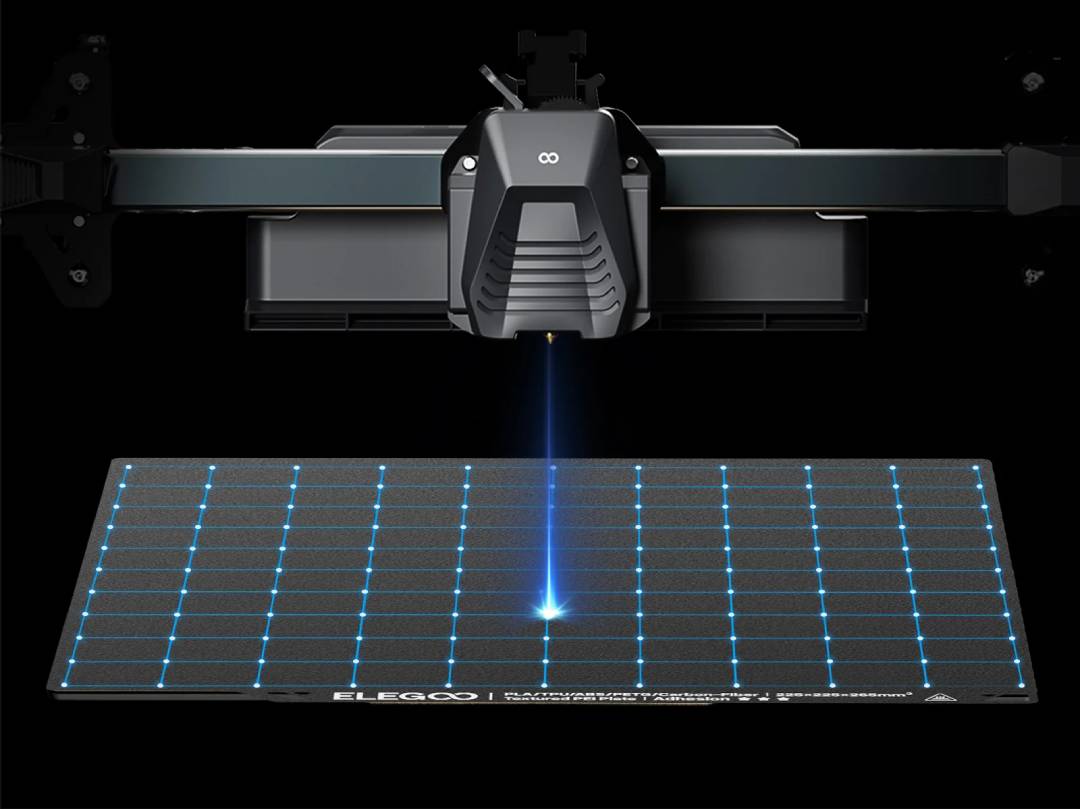 Precise platform leveling is achieved using a 121-point (11 x 11) system , ensuring perfect alignment of the first layer to the build plate. The build surface is double-sided – one side is optimized for PLA (for better adhesion at lower temperatures), while the other is textured PEI, ideal for materials with higher printing temperatures. This configuration allows for easy adjustment of the surface to the currently used filament, especially important when working with a wide range of materials.