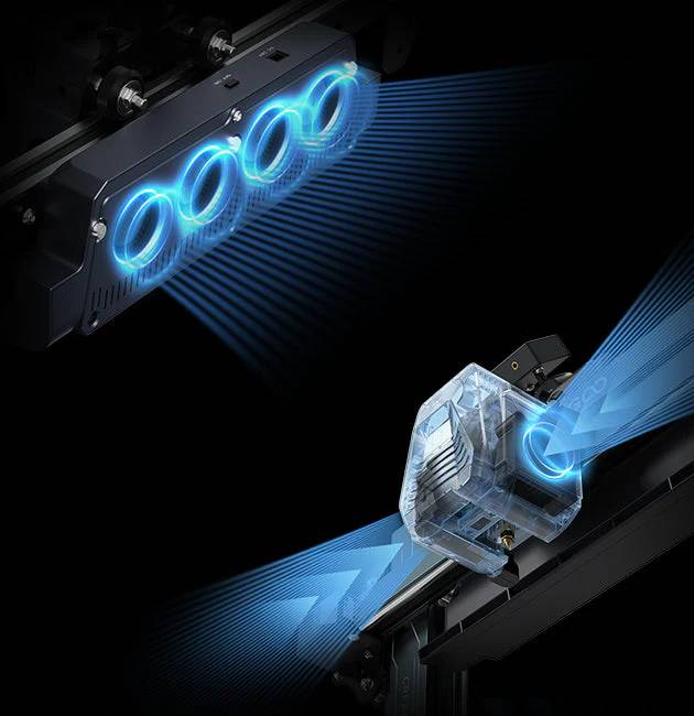 The Neptune 4 Pro offers effective layer cooling thanks to six fans : two 4015 side fans and four 4020 rear fans with ball bearings. This arrangement ensures immediate cooling of freshly printed layers even at very high speeds, translating into improved bridging and overhang quality. The printer's design is based on an aluminum CNC frame and POM guides , which ensure smooth and quiet operation. Additionally, all axes utilize stepper motor drivers with a low noise level of less than 50 dB .