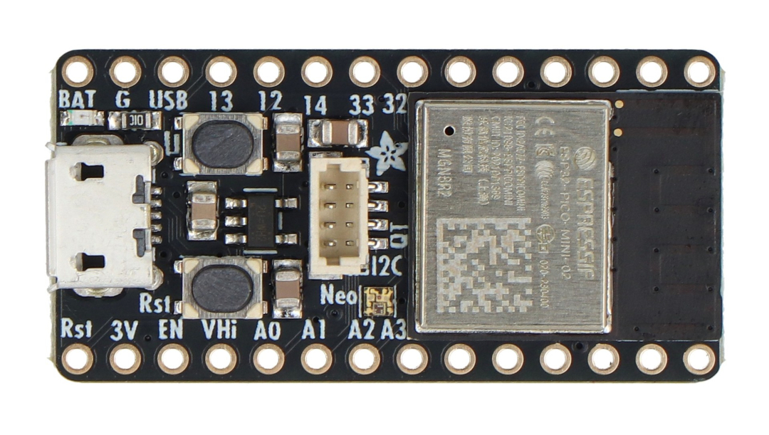 The Adafruit ItsyBitsy ESP32 is a miniature development board based on the ESP32-PICO-MINI-02 module, equipped with a dual-core Tensilica Xtensa processor clocked at 240 MHz . The chip provides 2.4 GHz WiFi, Bluetooth, and BLE connectivity, and thanks to an integrated PCB antenna , the entire board maintains a very compact size without the need for an external antenna. Despite its small size of 36 x 17.6 mm, the board offers 20 GPIO pins , a built-in USB-to-serial converter, an addressable NeoPixel RGB LED , and a STEMMA QT connector . Low power consumption in deep sleep mode of around 10 µA makes it ideal for battery-powered projects.