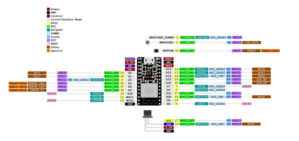 The ItsyBitsy ESP32 provides 20 GPIO pins , most of which support multiple hardware functions. It includes 13 12-bit analog inputs , two 8-bit DAC outputs (A0, A1), hardware UART, SPI, and I2C interfaces, and PWM support on every pin. The board also offers eight capacitive touch inputs that can be used as touch buttons without mechanical components. A dedicated D5 pin has a 5V logic level, making it easy to control NeoPixel LEDs and other devices requiring higher signal voltages.
