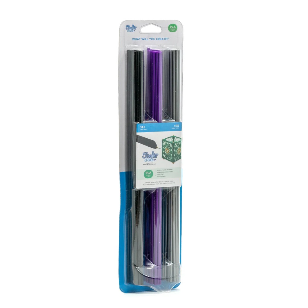Filament 3Doodler Create+ is a set of 75 high-quality PLA cartridges with a diameter of 3 mm , compatible with popular 3Doodler Create, PRO, 2.0 and 1.0 pens. The set includes three different colors - black, purple and gray. PLA material is environmentally friendly and works great in artistic projects thanks to its gloss and stiffness . It is an ideal choice for both beginners and advanced 3D pen users.