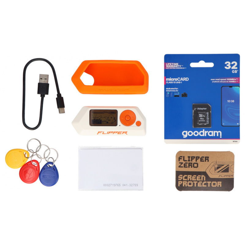 This kit has been designed to allow you to safely use the full capabilities of the Flipper right out of the box. The included 32GB microSD card is required for system operation and signal database storage. A dedicated orange silicone case and a set of protective films effectively protect the device from drops and scratches during field work. Additionally, a set of five RFID tags allows you to immediately test the cloning function without having to search for external targets.