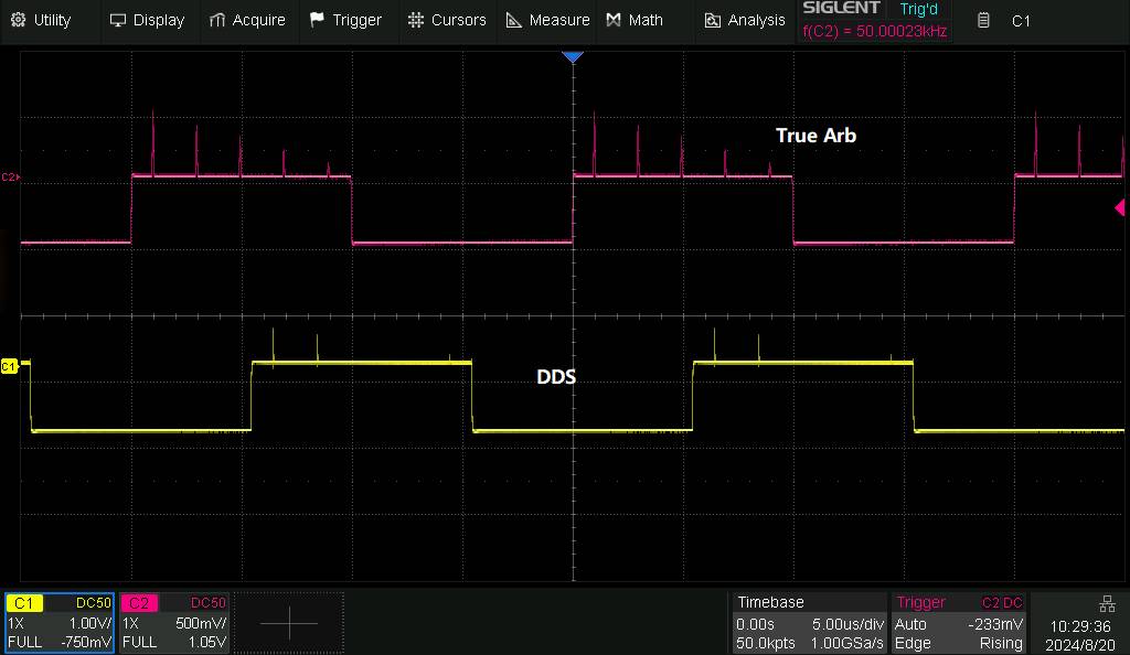 TrueArb technology, implemented in the SDG1062X Plus, enables the generation of arbitrary waveforms with complete precision at every point. Unlike traditional DDS generators, TrueArb operates on a point-by-point architecture, eliminating interpolation errors and jitter , resulting in exceptional signal fidelity. This technology allows for the generation of signals ranging from 24 Mpts to 8 Mpts in length at sampling rates up to 250 MSa/s.
