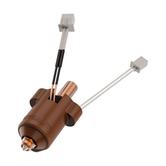 The ceramic hotend for the Creality Ender-3 V3 KE 3D printer is designed to increase 3D printing performance while maintaining thermal stability. The ceramic heater surrounds the heating block 360° , improving heat transfer efficiency, shortening heat-up time, and ensuring a more uniform temperature during operation. It enables material flow rates of up to 32 mm³/s , enabling print speeds of up to 500 mm/s (test data for a 0.4 mm nozzle at 240°C). The all-metal construction and thin-walled titanium-copper alloy heatbreak improve thermal insulation and control the filament melt zone. The kit includes two nozzles with a copper body and a hardened steel tip . The nozzle's inner surface has a roughness of Ra ≤ 0.4 for smoother material feeding and reduces the risk of blockages.