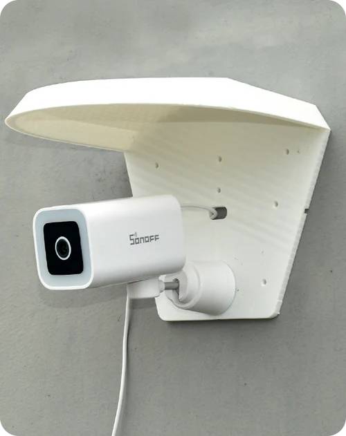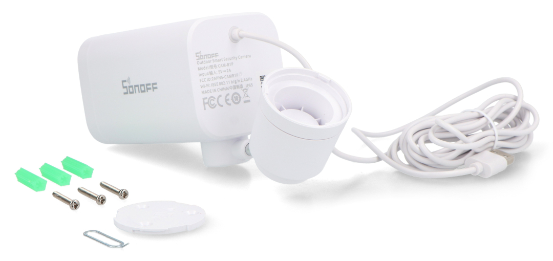 The Sonoff CAM-B1P is designed for wall mounting on a building's facade or under a roof . The kit includes mounting anchors and screws for secure mounting. The camera is powered by 5V/2A via a USB Type-A interface. Configuration is done via the eWeLink app after holding the reset button for 5 seconds and connecting to a 2.4GHz Wi-Fi network.