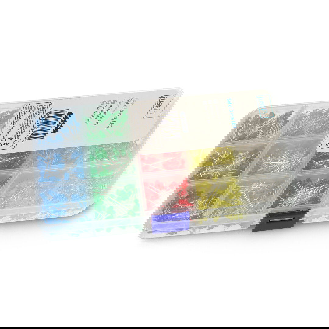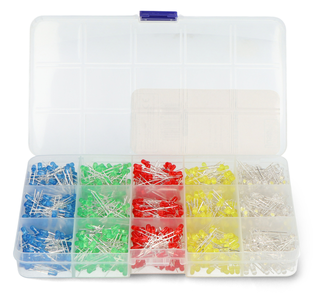 - The set contains 1000 LEDs with a diameter of 3 mm in different colors (red, green, blue, yellow, white)