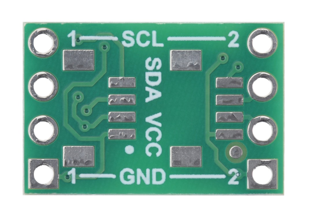 The module has solder holes spaced every 0.1'' (2.54 mm) allowing for connection using standard goldpin connectors or soldering wires directly. Side 1 of the module ( VCC1, GND1, SDA1, SCL1 ) and side 2 ( VCC2, GND2, SDA2, SCL2 ) are electrically independent and require a separate power supply. The pins allow easy connection to any I2C devices on both sides of the isolator.