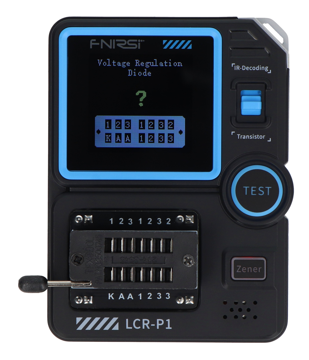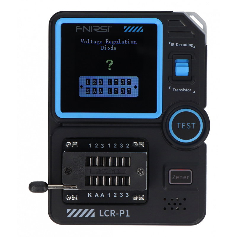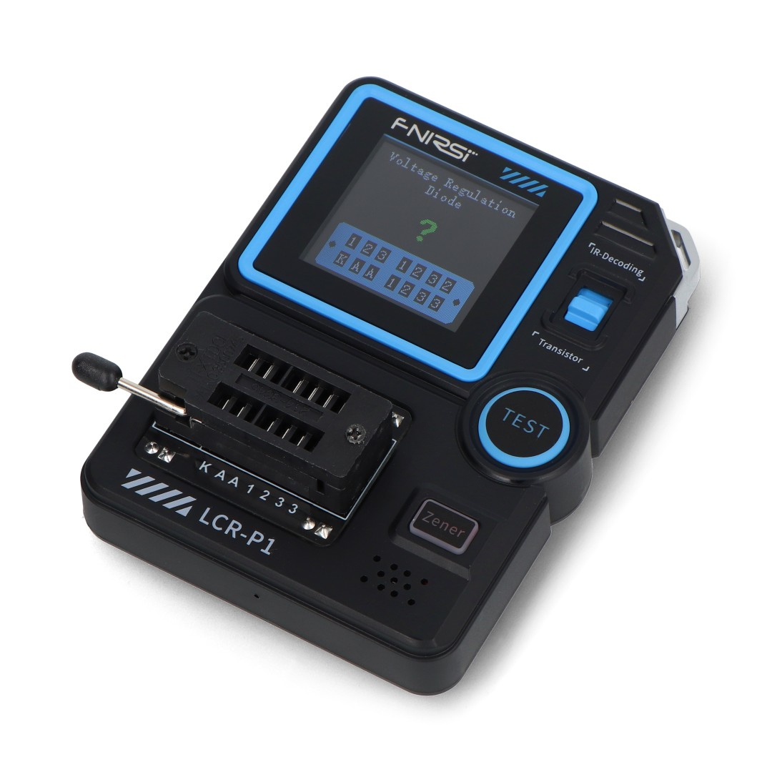 The FNIRSI LCR-P1 is a modern electronic component tester designed for engineers, technicians, and electronics enthusiasts. The device automatically recognizes the type of component being tested and its pinout , then displays key parameters on a clear 1.44" color screen . The tester allows you to measure a wide range of components, such as NPN and PNP transistors , MOSFETs, IGBTs, diodes, Zener diodes , capacitors, resistors, and inductors . Additionally, it supports infrared signal decoding in the NEC protocol , allowing you to test remote controls and IR devices. Thanks to its intelligent component recognition system, simply insert the component into the test stand and press a single button to obtain a measurement result. The Anti-Burn function protects the LCR-P1 from damage by automatically discharging capacitors before starting the test.