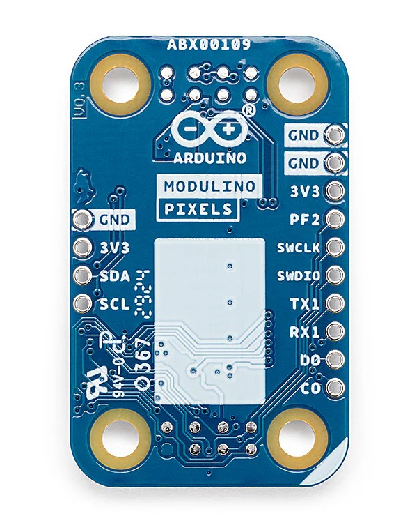 Modulino Pixels features a standard Qwiic connector , allowing for quick connection to compatible Arduino boards such as the Uno R4 WiFi , Nano 33 IoT , or Nano RP2040 . Communication is via an I2C bus , allowing for simultaneous connection of multiple modules on a single line . Additionally, soldered pinouts are available: GND, 3.3V, SDA, and SCL , allowing for connection to prototype systems or custom motherboards. This option significantly increases versatility and allows for adapting the system to more advanced projects.