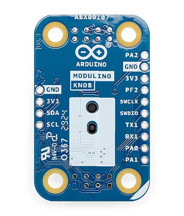The Modulino Knob communicates with boards like the Arduino via I2C , utilizing the Qwiic connector for quick and seamless connection. The default address of 0x76 can be easily changed via software, allowing multiple modules to be connected on a single network. For custom designs or breadboard prototyping, soldered GND, 3.3V, SDA, and SCL pins are available for mounting flexibility and compatibility with a variety of hardware solutions.
