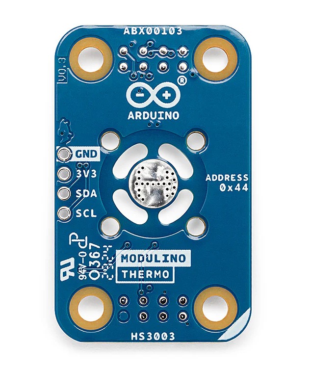 The Modulino Thermo uses an I2C interface and a Qwiic connector , allowing for immediate connection to Arduino boards such as the Uno R4 WiFi or the Nano series. Thanks to its address of 0x44 , the module can operate in parallel with other devices on the same bus. If your project doesn't use Qwiic, you can use the solder pins : GND, 3.3V, SDA, and SCL, providing greater flexibility for integration with non-standard or advanced hardware solutions.