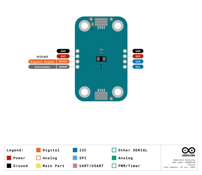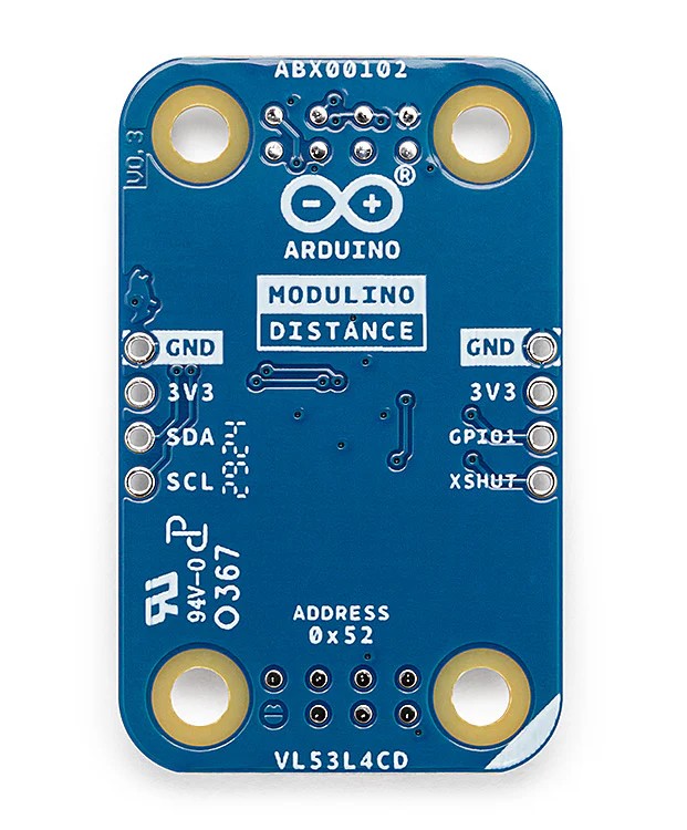 The Modulino Distance sensor uses an I2C bus and a default address of 0x29 , which can be changed via software. The Qwiic connector allows for soldering-free connection to the Uno R4 WiFi board or other Arduino Nano boards. Additionally, the module is equipped with four solder pins : GND, 3.3V, SDA, and SCL, enabling traditional wiring for custom projects or breadboard prototyping.
