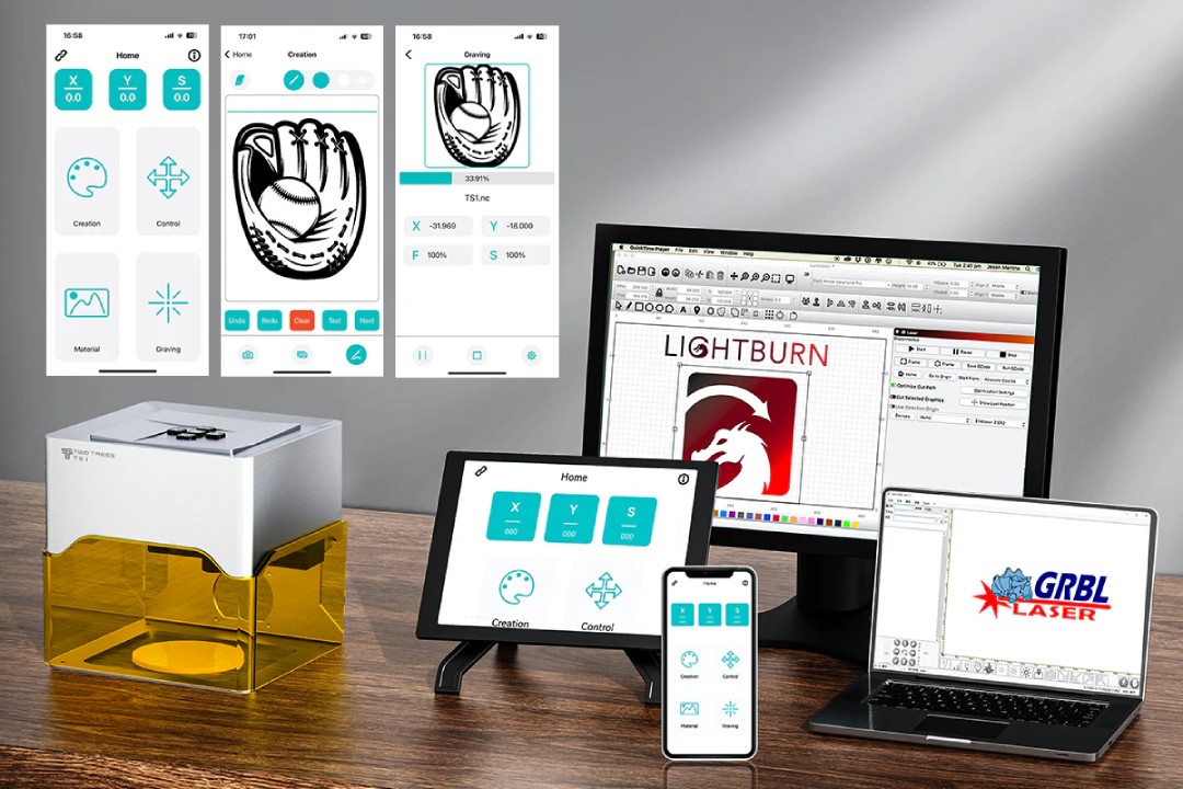 The TS1 Mini engraving machine offers a quick and simple workflow – simply connect it to your smartphone or computer, upload your design, and start engraving in seconds. The device works with popular programs such as Lightburn, LaserGRBL, and MKSLaser (a dedicated mobile app). The app's user interface is clear and allows for quick parameter setting, even for those without experience.
