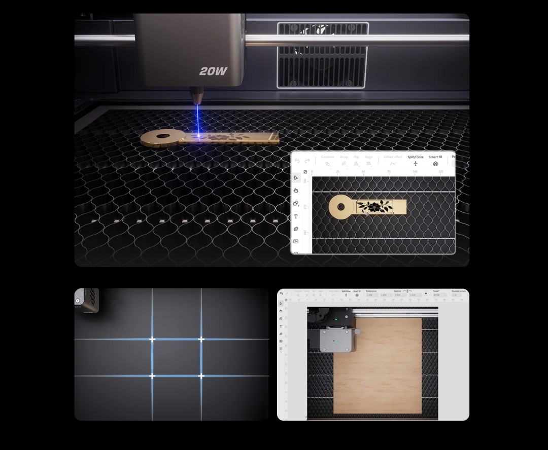 The integrated AI Vision system with an HD camera and laser rangefinder enables automatic focal length adjustment with an accuracy of less than 0.3 mm in just 3 seconds . This is a huge advantage, especially when frequently switching between materials or projects with different heights. The camera not only ensures focus but also allows for visual positioning of the artwork, real-time preview of the work area, and intelligent framing . This helps you avoid errors and achieve consistent results from the first use.