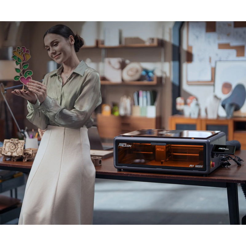 The Creality Falcon A1 Pro is a modern laser engraving machine designed for users who demand efficiency, simplicity, and safety . Equipped with a 20W blue laser , it offers a 268 x 358mm work area, allowing for cutting up to 10mm plywood and 8mm acrylic. The AI Vision system with an HD camera provides automatic focus and visual design positioning, while the touchscreen simplifies operation without a computer. A workflow speed of up to 600mm/s , support for over 300 materials, full integration with Falcon Design Space software, and a Class 1 enclosed design make the Falcon A1 Pro ready to work right out of the box – both in the studio and at home.