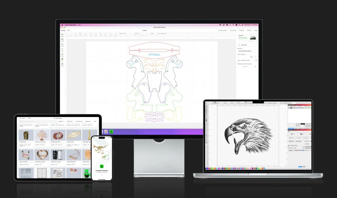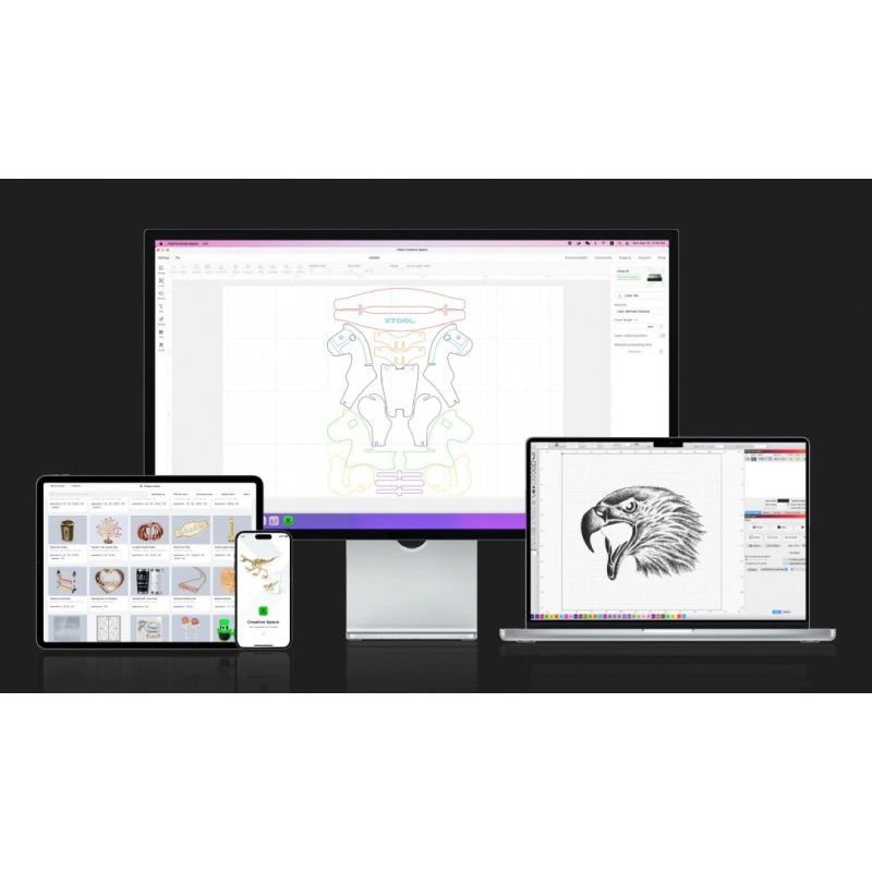 The xTool S1 works with the free xTool Creative Space (XCS) software , which offers over 1,000 pre-made designs, a shape library, and intelligent features such as autofocus and pattern-to-material matching. Advanced users can use the popular LightBurn software, which allows full control over cutting and engraving parameters. The device supports the most popular file formats (SVG, DXF, JPG, PNG, BMP, TIF) and is compatible with Windows, macOS, Android, and iOS , enabling convenient work from a computer, tablet, or smartphone.