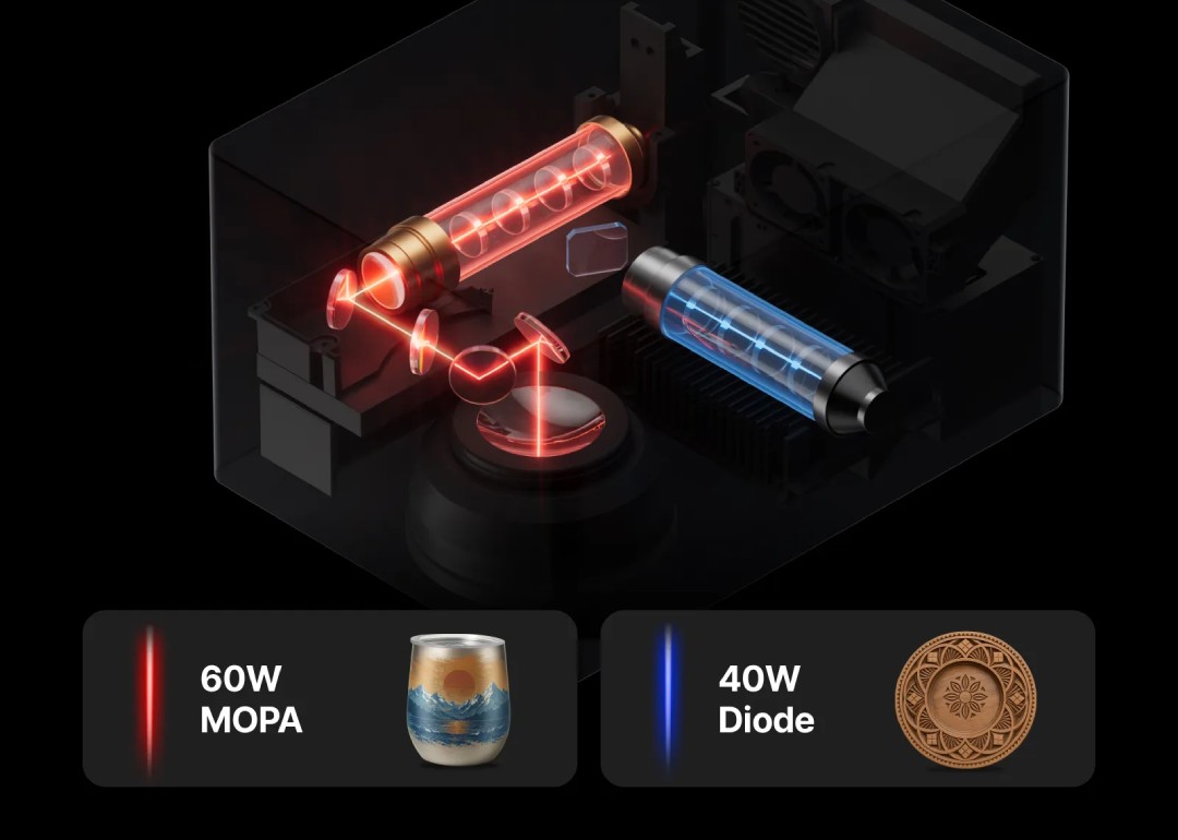 The xTool F2 Ultra utilizes a single 60W MOPA laser system , enabling a wide range of industrial applications. MOPA technology enables precise control of pulse width and frequency , resulting in deeper, more accurate cuts and more complex engraving effects—including holographic effects and a full color palette on metals . This technology allows you to achieve results unattainable with traditional diode lasers.