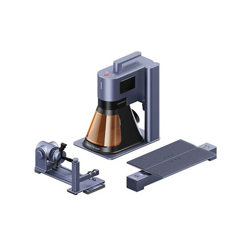 The LaserPecker LP5 is a modern, compact laser engraver with a dual laser source that combines a 20W diode laser (450nm) and a 20W fiber laser (1064nm) . This configuration allows for marking and cutting a wide range of materials – from wood and glass, through plastics, to stainless steel and precious metals. A speed of up to 10,000 mm/s and a precision of 0.0027 mm enable the implementation of even the most demanding projects – both in single-item and mass production. The LP5 stands out with its compact design and weighing only 3.36 kg , enabling both mobile and handheld operation . Thanks to the mobile app and compatibility with LightBurn software, operation is fast, intuitive, and flexible. It is an ideal solution for companies personalizing products, as well as for artists, creators, and CNC workshops. The Deluxe kit includes two key modules that extend the functionality of the LP5 - a rotary module for engraving on cylindrical objects and a Slide Extension module that extends the working area of the device to a length of 300 mm.
