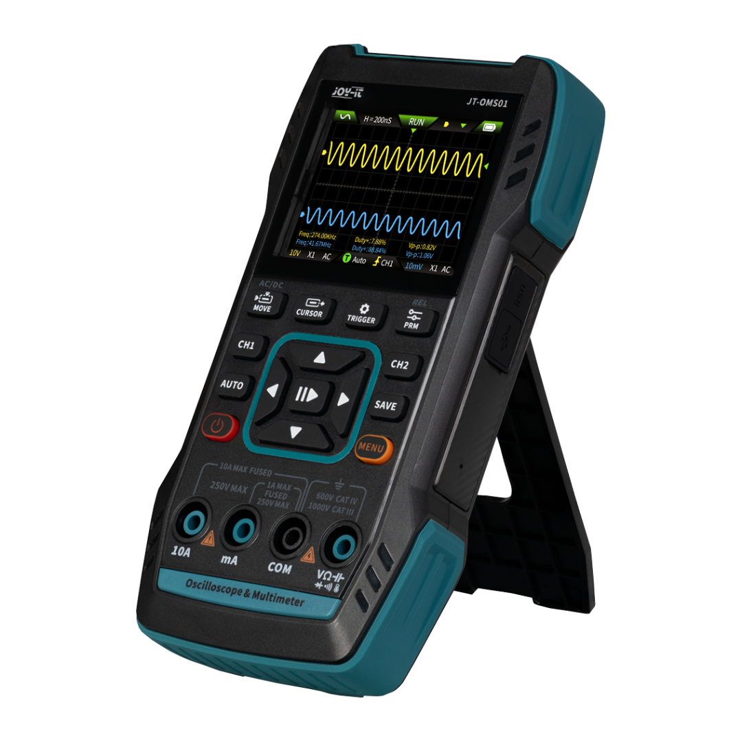 The Joy-IT OMS01 is an advanced, handheld 3-in-1 diagnostic device that combines the functionality of an oscilloscope , digital multimeter , and signal generator . It has been designed with maximum mobility and versatility in mind. With a 2.8-inch color display , a damage-resistant body, and an integrated stand, the OMS01 is perfect for both field and desk work. The device is intuitive to use, with the option of selecting a menu in Polish, English, German, or French . Powered by a built-in lithium-ion battery charged via USB Type-C , the device is always ready to use. The set includes a complete set of accessories and a practical protective bag.