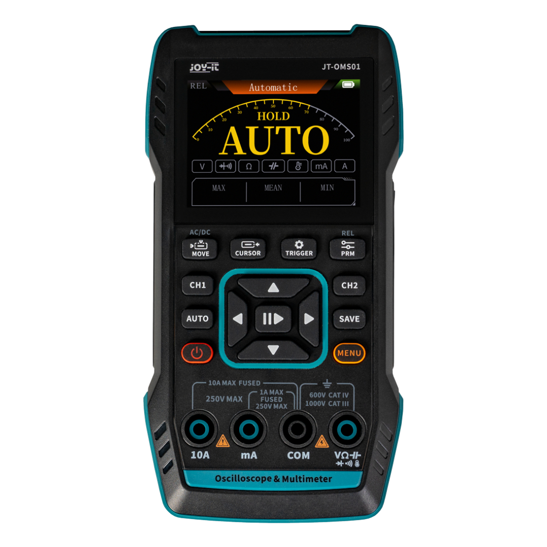 The Joy-IT OMS01 is an advanced 3-in-1 handheld diagnostic device that combines the functionality of an oscilloscope, digital multimeter, and signal generator.Technical specifications of the multimeter and signal generator