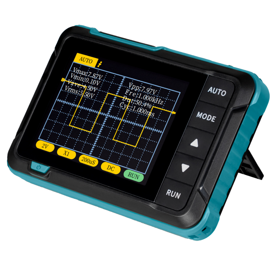 DSO-200 is a modern, handheld digital oscilloscope designed with comfort and mobility in mind. With its ergonomic shape and integrated, foldable stand, the device is perfect for both desktop and field work. DSO-200 operates in the 200 kHz band with a sampling rate of 2.5 MS/s and a wide range of vertical sensitivity (from 10 mV/div to 20 V/div) , which enables precise measurements of analog signals. The 2.8" color LCD screen provides a clear view of waveforms, and the power supply from the built-in 1000 mAh lithium battery charged via USB Type-C allows for long operation without the need to connect an external power source. Additionally, the DSO-200 offers various trigger and signal coupling modes, making it an ideal diagnostic tool for educational and service applications.