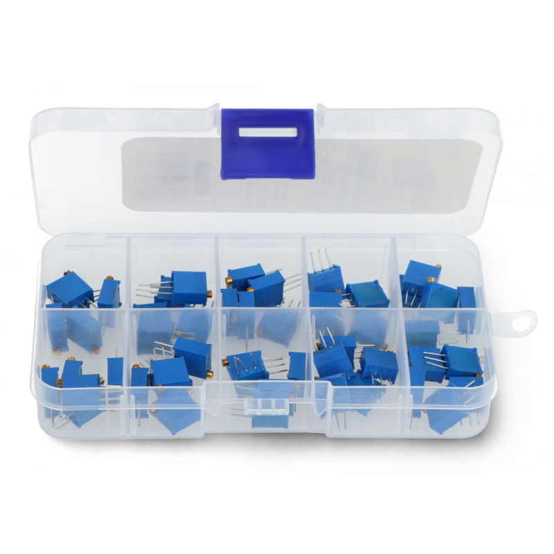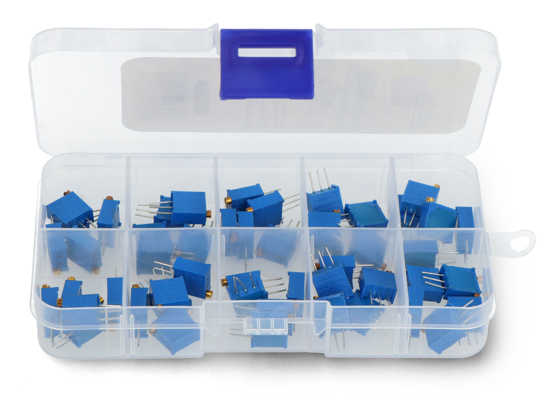 The E52 Trimpot Set contains 50 pieces of 10 different resistance values , 5 of each. The potentiometers have a blue housing, and the entire set is housed in a small organizer that allows for easy organization and storage. E52 potentiometers are widely used in electronics for precise resistance adjustments in various devices. The values included in the set cover a range from 500 Ω to 1 MΩ , providing great versatility in applications. It is recommended to avoid contact with harsh chemicals and use appropriate fluxes when soldering to avoid damage to the circuitry.