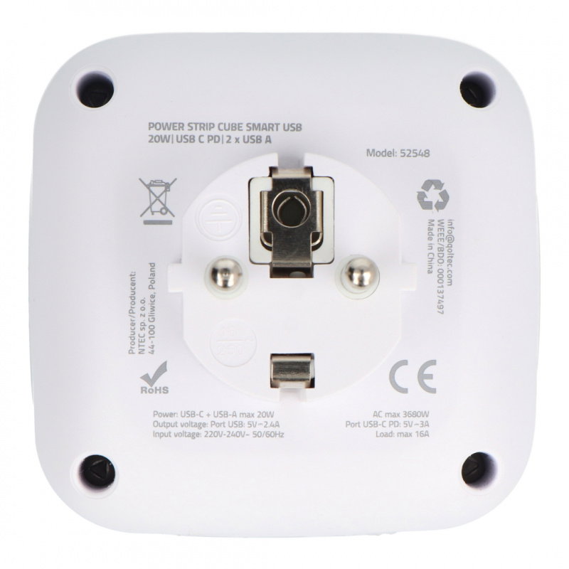 The Qoltec 6-in-1 power cube is a modern and compact solution that allows you to simultaneously power and charge multiple devices from a single location. Equipped with three Type-E power sockets and three USB ports (2 x USB Type-A and 1 x USB Type-C Power Delivery 20W), it eliminates the need for multiple chargers and extension cords, helping to keep your workspace tidy. The clever, cubic design and ergonomic socket layout ensure that even larger plugs don't block each other. The USB Type-C port with 20W Power Delivery allows for fast charging of smartphones, tablets, and other mobile devices, while the USB Type-A ports provide stable power for everyday accessories.