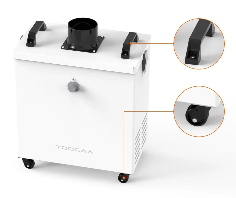 The TOOCAA Smoke Purifier effectively eliminates smoke, dust, and fumes generated during laser cutting and engraving . Its three-stage filtration system (pre-filter, medium-efficiency filter, and high-efficiency activated carbon filter) ensures fresh and safe air in the workshop. The compact housing with handles and wheels facilitates transport, while the sealed design prevents smoke leaks, ensuring high operational efficiency.