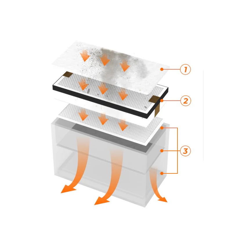 The smoke purifier uses an advanced three-filter system that removes dust, smoke, and harmful gases. The first layer is a pre-filter (low-efficiency filter cotton) , which traps larger particulates and protects the subsequent stages. Next, the air passes through a medium-efficiency filter (honeycomb filter cotton) , which captures up to 99.97% of particles as small as 0.3 μm . The final stage is a high-efficiency filter (activated carbon filter cotton) , which neutralizes volatile organic compounds and unpleasant odors.
