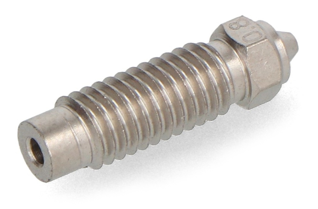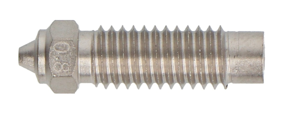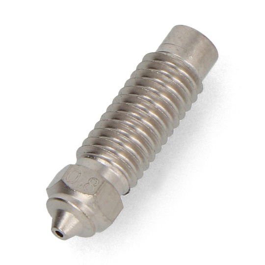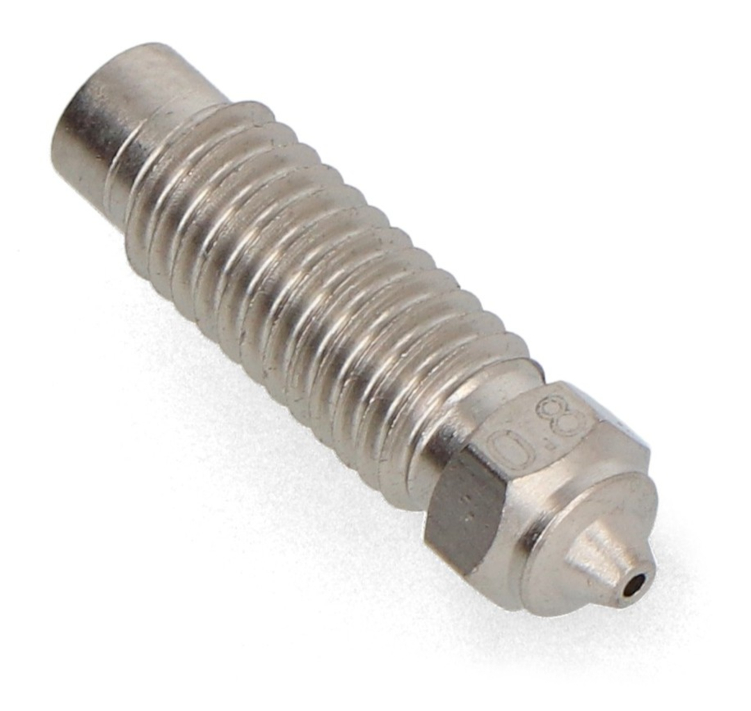 The 0.8 mm hardened steel nozzle is the ideal choice for printing large and durable models from technical and composite materials. It also works well with filaments containing abrasive additives . Its large outlet diameter enables rapid material extrusion , reducing print time while maintaining layer quality.