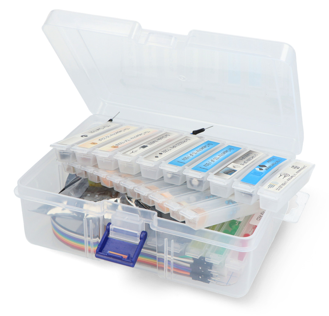 The Arduino electronics kit includes 235 essential parts, carefully assembled. They are based on a 400-pin breadboard, used for prototyping circuits, and include numerous other components. All of this is packaged in a practical container.