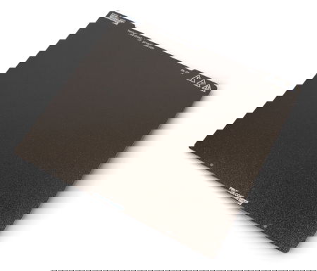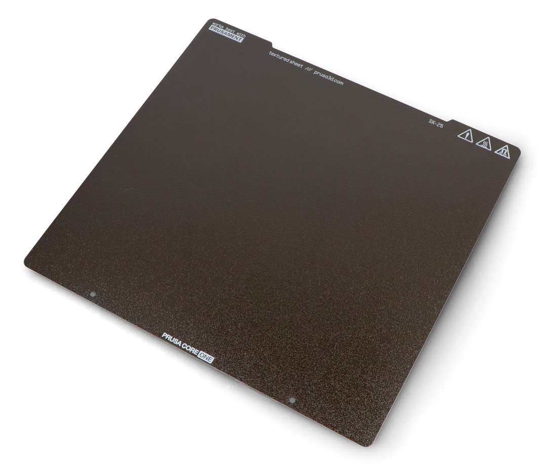 The plate is made of spring steel and features a durable powder coating that resists scratches and impacts from a heated nozzle . Designed for Prusa CORE One printers , the textured surface not only improves print adhesion but also masks minor mechanical damage incurred during operation. The powder coating ensures even heat dissipation, protecting the plate from deformation when in contact with the heated nozzle . The textured surface gives prints a distinctive, subtle pattern that is visible from the underside of the models , and minor scratches do not affect print quality.